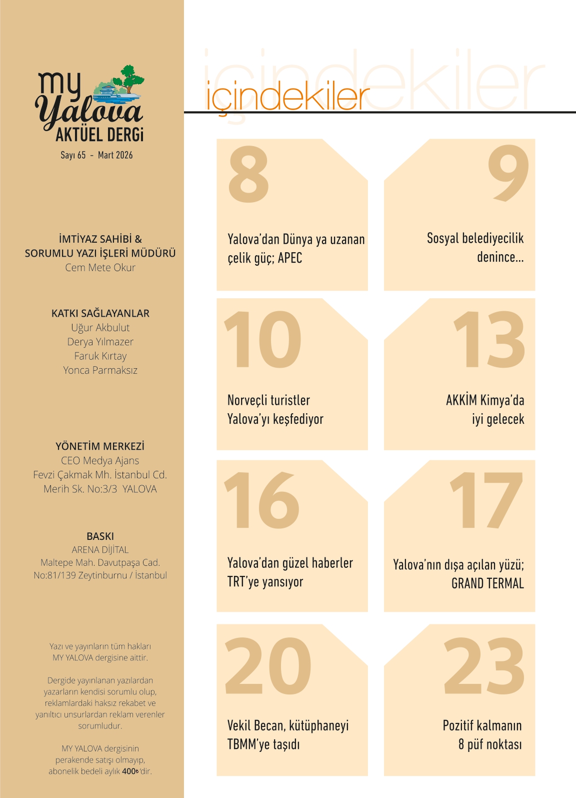 Benzer içerikler … MY YALOVA 64.SAYI MY YALOVA 63.SAYI MY YALOVA 62.SAYI Yorum Yap Yanıtı iptal etE-posta adresiniz yayınlanmayacak. Gerekli alanlar * ile işaretlenmişlerdirYorum * Ad * E-posta * İnternet sitesi Daha sonraki yorumlarımda kullanılması için adım, e-posta adresim ve site adresim bu tarayıcıya kaydedilsin. MY YALOVA 65.SAYI Yayınlanan: Mart 7, 2026 Önceki: MY YALOVA 64.SAYI